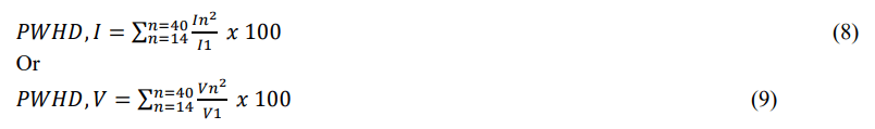 PWHD can be expressed as the ratio of the voltage or current within a selected group of harmonics higher order (say 14th order to 40th order) to the fundamental values of the current or voltage, as the case may be. PWHD equations for current and voltage can be given as shown in equation 8 and 9 below (Durdhavale, 2016)