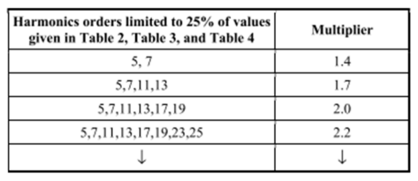 Following recommendations, the values as seen in Table 7, Table 8 and Table 9 can be increased by a multiplying factor when the user decides to reduce the magnitude of lower-order harmonics. The multipliers are given in Table 10 below and are put into use when steps are taken by the user to reduce the harmonic order shown in the first column of the table.