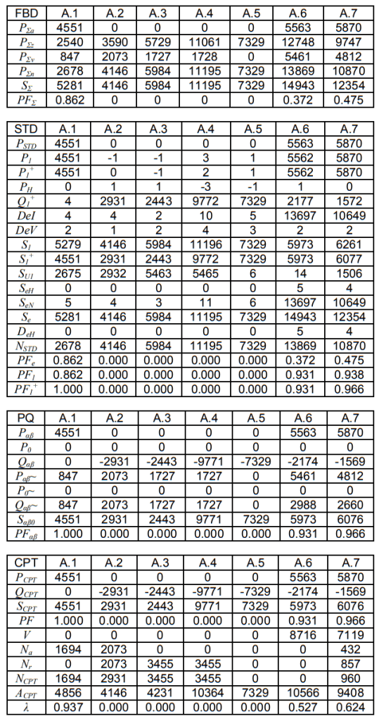 Applying the FBD, it is possible to notice that the collective active and apparent power exactly match the active and effective apparent power from the STD. The same happens with the PFΣ, what means that the load unbalance has been considered as a non active power. Indeed, the load unbalance affects PΣz, PΣv and PΣn.