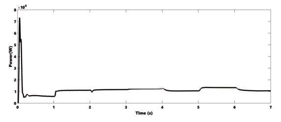 If the extracted power is higher than the needed power, the excess amount of power is used to charge the storage batteries. Once the SOC of the batteries attains 80%, load 1 is supplied. If the remaining excessive power, after feeding load 1, is high enough Load 2 will be supplied. If the wind speed and solar insolation are not enough to generate the power needed by the main load, the battery bank takes over to cover the load demand, if its SOC is greater than 80%, otherwise the motor is disconnected from the system. Results and Discussion The Simulink simulation model of the investigated system, including all system components, is shown in Fig. 8. The model includes variable speed wind turbine and surface mounted PMSG with their MPPT controllers, battery bank and dump load with the controllers, power conditioners (three phase diode rectifier, DC choppers, three-phase voltage source inverter), separately excited DC motor as a dynamic DC load, with its speed controller, two three-phase static AC secondary loads and power management scheme. Fig. 9 and Fig. 10 show wind speed and solar irradiation profiles, respectively. These profiles are used to assess the proposed system performance under the changes in the atmospheric conditions. The generated electrical output power from wind driven PMSG, PV-array and the storage battery bank are shown in Fig. 11, Fig. 12 and Fig. 13, respectively. It can be noticed that the variations in the atmospheric conditions; wind speed and solar irradiation, play an important role in the generated output power from the two renewable energy sources. In other words, the curve for the results of the generated output power from each source follows the same manner of its considered profile. The maximum and minimum generated power from the two main power sources, during the considered profiles, are 10.39 kW and 5.607 kW, respectively. This is sufficient to meet the main load demand (DC motor driving water pump) for the complete considered period. Due to insufficient wind speed or / and solar irradiation during certain intervals the total generated power from the two sources could not meet the load demand of AC load 2 of 5 kW, or even AC load 1 of 2.kW. Enhancing the generated power with the battery bank output power, which is shown in Fig. 13, enables the system to cover the load demand of AC load 1 for nearly the whole considered period. The remaining power is not enough to supply the additional AC load 2 of 5 kW as can be noticed in Fig. 14.