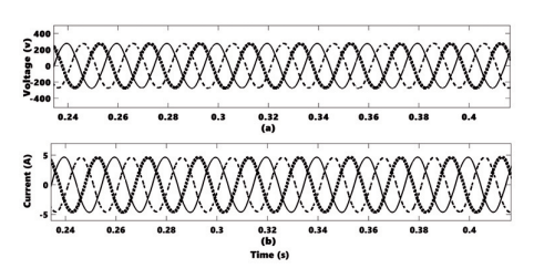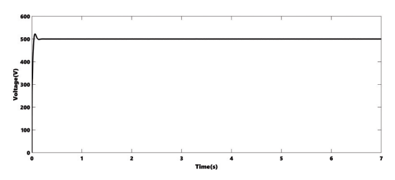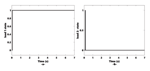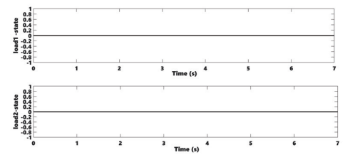Fig. 15 shows the dump load ON/OFF states. The ON state presents the case when the DC link voltage is greater than the reference value and the battery bank SOC is above 80%. The dump load remains OFF as along as the DC link voltage below the reference value or the battery bank SOC is below 80%. As a result of controlling the states of the dump load, the DC bus voltage remains constant at the prescribed value. The response of the DC bus voltage during the considered profiles is shown in Fig. 16. It can be noticed that the DC link voltage has a fast response with very small percentage overshoot before is settled down to its final value of 500 V. Moreover, the voltage response has approximately zero steady-state error. The waveforms for the three-phase voltages and three-phase currents obtained from the inverter are shown in Fig. 17. It can be seen that the inverter provides fixed voltage and frequency supply. The speed response of the DC motor for different values of reference set speeds is shown in Fig. 18. It can be noticed that high performance speed control is achieved. The speed characteristic has a fast-dynamic response with nearly no overshoot and approximately zero steady state error. Fig. 19 presents the obtained output DC voltage for the profiles of Fig. 9 and Fig. 10, when storage batteries and dump load are excluded from the proposed configuration. It can be seen that the DC voltage is not fixed, but it is varying in response to the environmental condition (changes in wind speed and/or solar irradiation). The reduction in the DC voltage below certain limit will badly affecting the DC motor speed control. Moreover, the exclusion of the storage batteries will extend the shortage period in feeding the load demand. This can be observed in Fig. 20 where the two AC loads are OFF for the complete considered period. These results validate the importance of enhancing the system with a storage battery bank and dump load incorporated with their needed controllers.