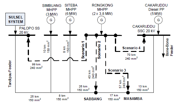 4. Scenario 3: Rongkong MHPP is connected to a Tandipau Feeder with a 20 kV voltage at one of the distribution substations in Masamba City. Electrical energy will be channeled using an A3CS 240 mm2 conductor along 57 km.