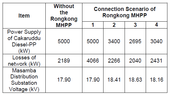 Of the 4 (four) scenarios, technically and economically (voltage drop, power losses, and investment) the scenario chosen for the connection of the Rongkong MHPP is scenario 2. Of the 4 scenarios, interconnection has been described by maximizing the use of Cakaruddu Diesel Power Plant by 5000 kW.