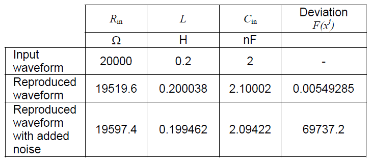 Table 1. Calculated equivalent scheme parameters – selected results (parameters of the reproduced waveform were Rin = 2 kΩ, L = 0.2 H, Cin = 2 nF)