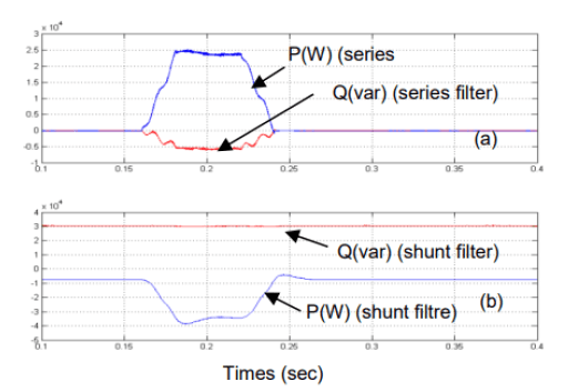 As illustrated in figure 10-b, the reactive power average value measured from the source side, is still close to zero regardless of the perturbation imposed by the voltage sag. While the reactive power measured from the load keeps an almost constant value about 29.33 (kvar) (Figure 9 – a). It should be noted that during the voltage sag, the reactive power measured in both the network side and load side are slightly affected. Since during the disturbance time, the shunt filter conveys simultaneously two powers; the active power from the network towards UPQC for stabilizing the voltage across the condenser and also the reactive power from the UPQC to the load for improving the power factor.