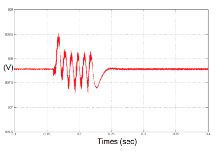 Figure 13 shows the voltage across the storage condenser that it overshoots its reference value (337.7 V) during the disturbance time. This phenomenon is interpreted by an active power excess due to an absorption of the active power from the network to the condenser through the series active power filter (Figure 18- a).Therefore, the DC bus voltage control loop always intervenes to stabilize the VDC value or balance the power flow in the storage condenser. Nearly the same amount absorbed by the series filter is simultaneously evacuated to the network with the shunt filter (Figure 18-b). During this correction, the source gives only the difference in amount energy required by the load. This is explained by a diminution in supply currents (Figure 12-c).