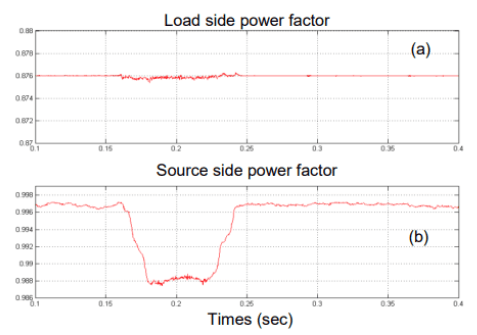The figure 6 shows that during the normal operation, the power factor measured on the source side is very close to unity with an average value of 0.997, but at the voltage sag time, the reactive compensation quality is reduced with an average power factor value of 0.988, whereas that measured at the load side does not exceed 0.876.