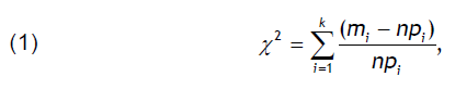 where n – the sample size, mi – the relative frequencies of the empirical distribution, pi – the corresponding theoretical probability densities, k – the gradations number.