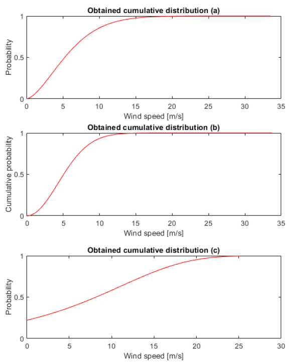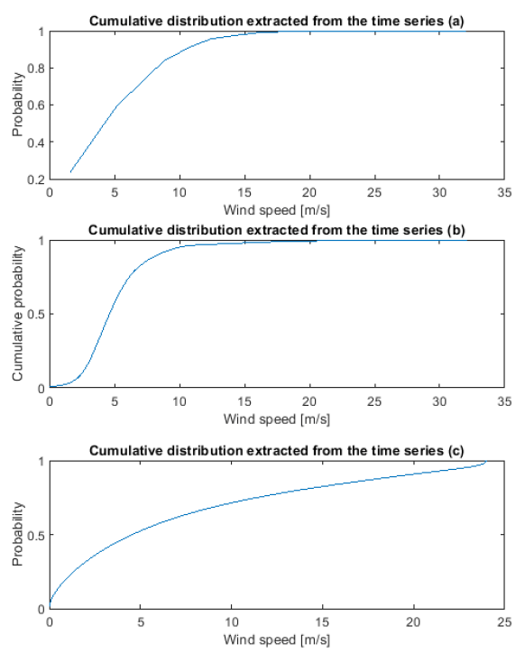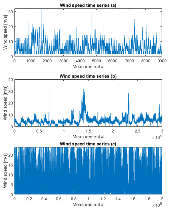 For the experiments, three samples of wind time series data with unknown CDF were taken. The sample size is between 9000 and 200000 volumes, depending on the example. The first sample (Fig. 1a) was taken from one of the graphical method experiments to study Weibul’s law parameters, and was randomly generated. The second time series is taken from the small-scale wind turbine power curve study (Fig. 1b) [17]. The third sample (Fig. 1c) is taken from the wind hourly NUTS 2 time series array [18].