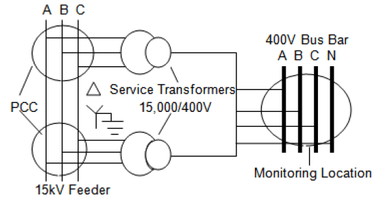 To assess the level of harmonic distortion in the industry power system, monitoring has to be performed at the service entrance points of the industry at the Points of Common Coupling (PCC), the tapping point on the 15kV feeders. However, as the distance and line impedance, from PCC to the primary of the transformer is negligible, the primaries are taken as PCC as shown in figure 1 [2].