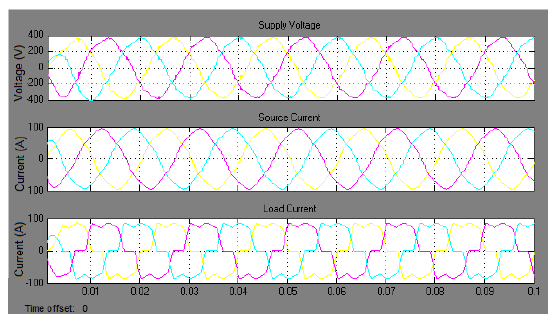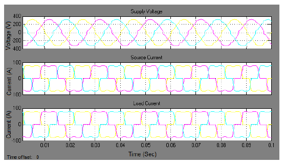 The voltage and current waveforms before applying the harmonic filters is shown in figure 3.