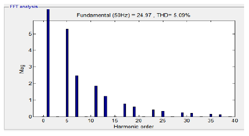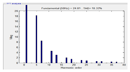 The industry has non-linear loads which are supplied by the utility and these loads draw a distorted harmonic voltage and current waveform as shown in figure 3 and from the Fast Fourier Transform (FFT) analysis as shown in figure 4 the THD value is 18.33%, which is above the IEEE standard acceptable limit, i.e. 5% for this study. Therefore, to reduce the harmonic distortion, single tuned, double tuned, high pass and c-type harmonic filters are designed and placed at the appropriate location at the industrial power system; consequently, the harmonic distortion is reduced and their performance is compared.