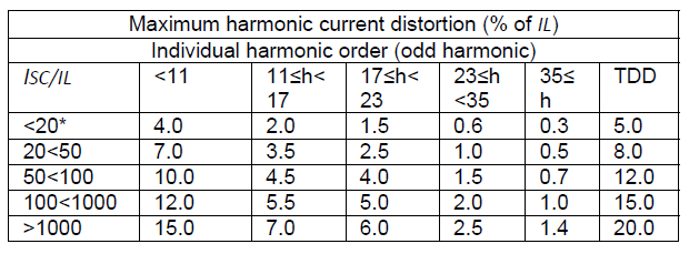 Table 1. Current distortion limits for general distribution systems (120V to 69 000V) [2].