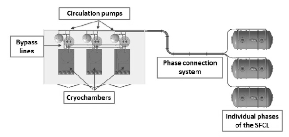 The SFCL cryostats were double-walled tanks with vacuum insulation. The walls were made of stainless steel to withstand the internal pressure. Each cryostat was leak tested with helium up to 15 bar. The special feature of these cryostats are two hatches removable from both sides, enabling maintenance, connection and disconnection of superconducting assemblies from the sleeves and other technical activities. The diameter of the holes was limited to 0.5 meters, which allowed access to the interior of the cryostat with a reasonable level of engineering difficulty. Each phase of the SFCL was equipped with its own cooling subsystem. The diagram of the limiter’s cooling system is shown in Figure 6 [9]. The cooling subsystem consists of a pressure builder, a Turbo-Brayton NeoKelvin cryochamber (rated cooling capacity 2kW at 70K, built by Taiyo Nippon Sanso), a circulation pump (Cryozone) and a pipe (Nexans) for transporting liquid nitrogen. Redundancy is ensured by bypassing the separate phases: even if one subsystem fails, the SFCL remains fully operational.