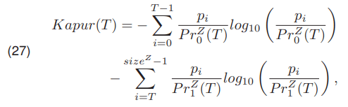 On the other hand, Kapur presented a method [21] in which the threshold is selected by maximizing the function Kapur(T) (27)
