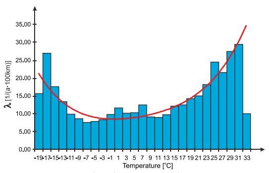 When designating the value ¯λ(Ti) for subsequent ranges i, the empirical dependency of failure intensity on the ambient temperature is obtained.