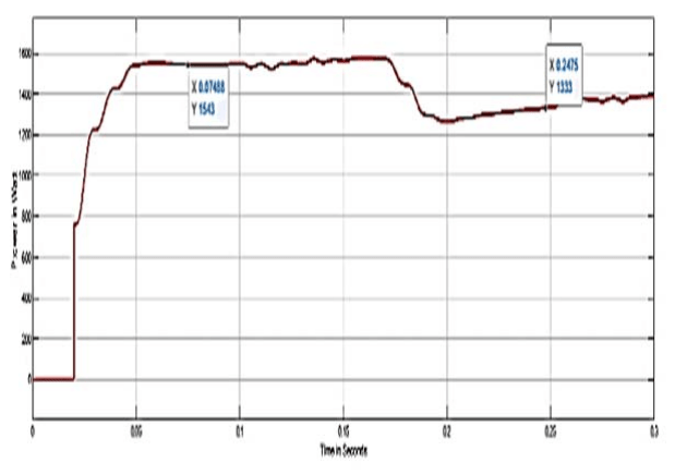 The current waveform is as indicated in figure 11. The magnitude of current is 14.54 A at t= 0.02s to t=0.16s. At t=0.16s the linear load is removed and hence the magnitude of the current is reduced to 12.3A. After UPQC compensation the power waveform is as shown in figure 12. The magnitude of power is 1543 W at t= 0.02s to t= 0.16s. As the load is removed at t=0.16s, the power magnitude also reduces to 1333 W. The power factor after UPQC compensation is as shown in figure 13, where the power factor is improved to 0.98 compared to 0.94 without UPQC compensation. As per IEEE standards 519-1992: For general distribution system, current distortion limits obtained by the simulation performed lie within the limit.