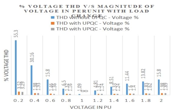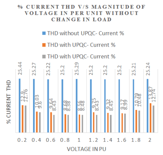 The above-defined power quality-related issues are mitigated using a combination of shunt and series active power filters called UPQC with PWM and hysteresis controller as shown in figure 9-figure 11.The bar chart representation of THD for voltage and current without UPQC, with UPQC PWM and UPQC Hysteresis is shown in figure 14 –figure17. It can be concluded that PWM controller gives good performance when compared to hysteresis controller. The power and power factor, corresponding RMS voltage, and current is analyzed to show the effectiveness of UPQC designed to improve the power quality.