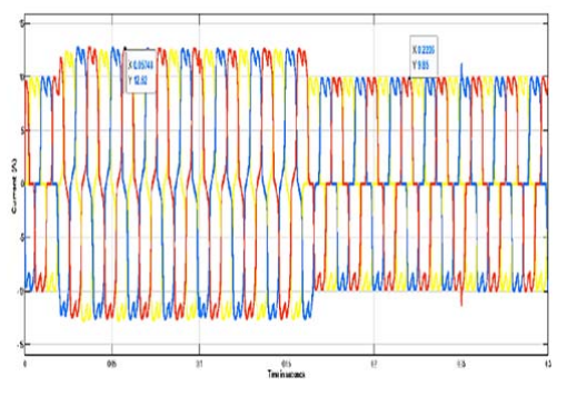 The three-phase voltage source of 415V, 50 Hz is integrated with a Microgrid designed with solar and wind generation connected to linear and nonlinear load . The magnitude of the voltage at the microgrid is maintained the same as the supply voltage as it is connected in parallel. The supply voltage is observed to be 229.2 volts phase to phase as shown in figure 1, at t=0s to t=0.1s. The voltage sag of 0.6 pu is introduced at t= 0.1s to t= 0.25s whose magnitude is reduced to 138V as indicated in figure 1, at t= 0.1s to t= 0.25s.Its corresponding RMS voltage is shown in figure 2. The power system is connected to a nonlinear load of a three-phase bridge rectifier with R= 40Ω and L=1e-4 H through a transmission line of resistance 0.002 ohms and inductance of 1e-5 H. At t=0.02 s, the linear load is added to the system to analyze the effect of a sudden change in load on the power system considered. The decrease in voltage and increase in current from t= 0.02s to t=0.16s, due to the addition of load is shown in figure 3 and figure 4.