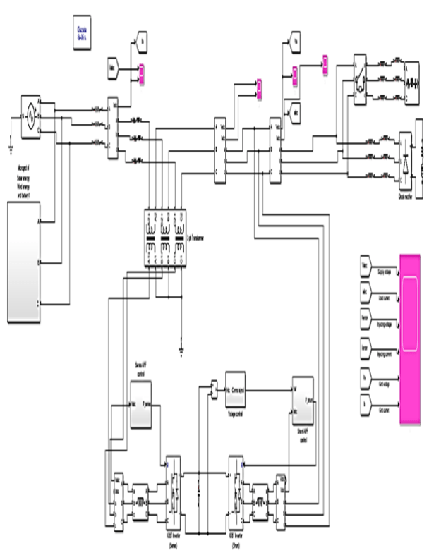 Three-phase voltage source in parallel to the microgrid at the supply terminal is connected to a three-phase load (both linear and nonlinear) through the transmission line. The UPQC comprising of series and shunt compensator is as shown in figure 8. The series active filter is designed using a unit vector control algorithm. The single phase input is fed to the phase-locked loop with the gain of 0.005 to obtain the value of wt. The three-phase voltage is derived by using the equation (1) – (3) which is then compared with the supply voltage to determine the error in voltage that derives the switching signals using the method of pulse width modulation.