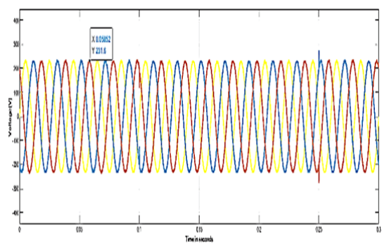 The series and shunt compensation is provided by using a MOSFET-based universal bridge inverter connected along with the interfacing inductor of 4e-3 H. The simulation results after providing UPQC compensation for the problem formulated are shown in figure 9. In figure 9, at t= 0.05s and t=0.15s, with a magnitude of voltage 231.6 V. Its corresponding RMS component of voltage is shown in figure 10.