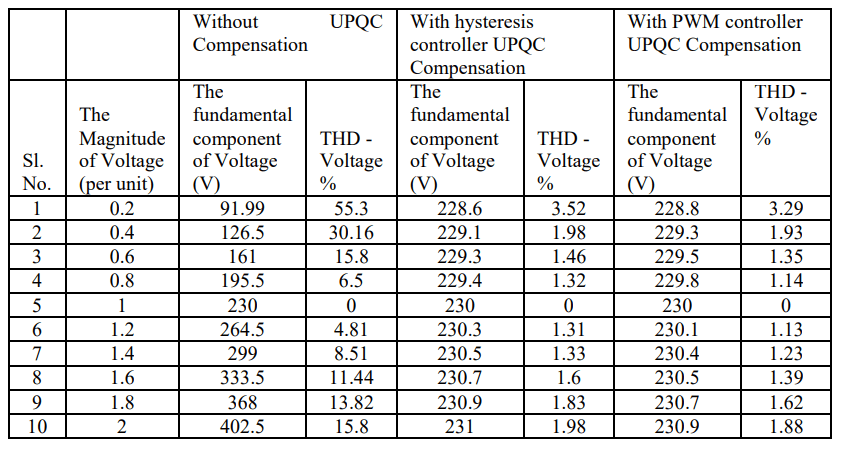 The comparison of simulation output obtained from PWM and hysteresis controller for system without variation in load and with variation in load for different magnitudes of voltage sag and swell and harmonic orders are as tabulated in table 1 to table 6.