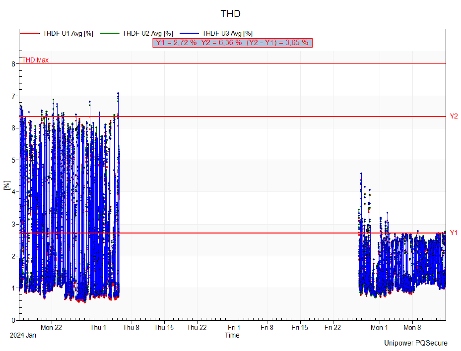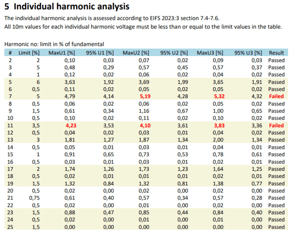 The measurement data indicated that the Swedish power quality standard (EIFS) had been exceeded due to harmonic content in the 7th and 11th harmonic. EIFS is a local adaption of the European EN50160 norm.