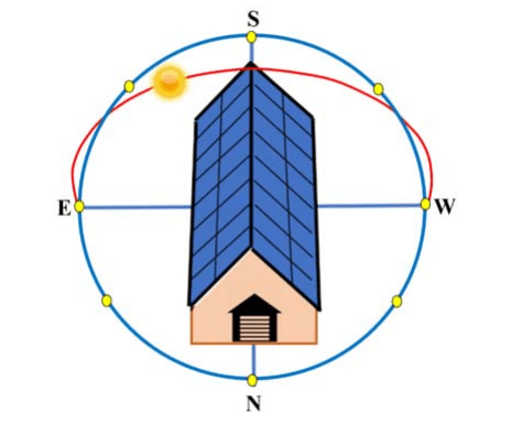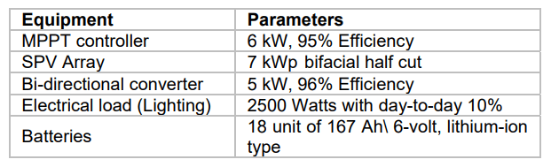 The standalone solar photovoltaic system (SA-SPV) simulated in this paper is a ceiling mounted SA-SPV system implemented in East-West mode, the first string at 90° azimuth (East) while second string at 270° (West) as shown in Fig.1, that’s in order to extend PSH time as possible, the system capacity is 7 kWp bifacial half cut modules, installed on a poultry house ceiling located in Erbil city, Iraq shown in Fig. 2. A BES of eighteen lithium-ion batteries (167 Ah – 6 V) is used to store the electricity produced during daylight to support the standalone mode system during the night. a unidirectional inverter (5 kW) works to convert the stored power into AC for lighting (2.5 kW) bulbs in the warehouse during the night for some time up to eleven hours a day.