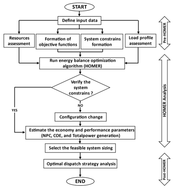 The HOMER Pro has been used to simulate the system performance, it is a micro-grid computer platform from HOMER Energy that is used for increasing the efficacy of is utilized for optimizing many microgrid designs that are located in different regions. It includes the use of the HOMER energy system in villages and islands so that utilities are provided to military bases, ON-grid campuses effectively. . Firstly, it was developed by National Renewable Energy Laboratory in the USA, and then the system was improved and disseminated through HOMER Energy LLC. HOMER includes a package of three robust tools in one software. It helps in executing industrial and financial work with each other to achieve the optimum goals of renewable energy systems. HOMER, in essence, is a simulation model. It focuses on simulating a feasible framework for all possible arrangements of all equipment that are to be taken into account. As a result, there is a simulation of the hybrid micro-grid working over one year, at a step time scale from (1 to 60) minutes which is set via moderator [6]. [6].Many scientific researchers had utilized HOMER for studying and analyzing [7],[8],[9] The simulation via HOMER required an extensive collection of data such as renewable resources data, energy storage layouts, control algorithms, and many power flow specifications as well economic restrictions. here is below a flowchart of the HOMER process shown in Fig. 3 which explain all the simulation steps in detail [10]: