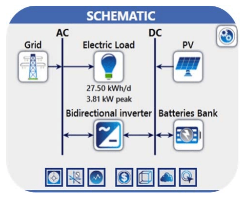 The simulation of Standalone SPV system The scheme in Fig. 4 shows the standalone solar photovoltaic system with a bi-directional inverter at the HOMER pro simulation platform, the unidirectional converter in the existing standalone system is replaced with a bi-directional converter. As a result, the main function of the system is to charge the battery full during the daytime. It helps BES to discharge power during the night until the power goes down to the lowest voltage of 46 V. In this aligned system, when the BES is charged and there is still surplus power, the additional power is supplied to the local grid. Therefore, the bi-directional converter is highly efficient in carrying out the charging and discharging of BES along with feeding power to the grid. It leads to optimized utilization of the existing capacity of the SA-SPV system. Technical data for subsystems utilized in the simulation are reported in Table 1. The system is optimized for a one year.