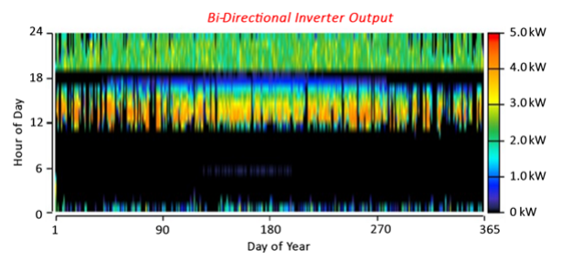 When the battery bank is completely charged, the two-way converter (bidirectional) supplies power to the local grid throughout the daytime. While during night time it will provide the required electricity to the warehouse lighting load. The output profile in Fig. 6. represents the D-Map of bi-directional inverter performance throughout the year. It can be seen that after the battery bank is completely charged. the bidirectional inverter feeds energy to the local grid on almost all days of a year. as well as provides energy to warehouse lighting load for all nights of the year, till the battery bank charge declines and reaching to the cut-off voltage which, according to the D-map lies between 1:30 A.M. to 2:30 A.M. Thereafter, the local grid provides electricity to the warehouse lighting load.