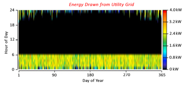 After the battery bank (BES) is fully discharged via reaching the cut-off voltage the local grid will feed the load with the necessary power. Fig. 7 represents the D-Map of local grid performance throughout the year. It is shown that warehouse lights draw electricity from the local grid from 1 A.M. to 6 A.M. It indicates that the BES power is not sufficient to provide electricity to warehouse lights all night