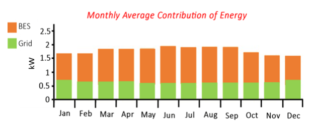 The overall energy supplied to the load is a sum of energy taken from the battery bank and local grid. Fig.8 represents the monthly contribution by the local grid and battery bank feeding warehouse lights during a year. The simulation results showed that annual energy contribution of the local grid represents 64 % while the battery bank is 36 % of the overall energy drawn via the lighting load.