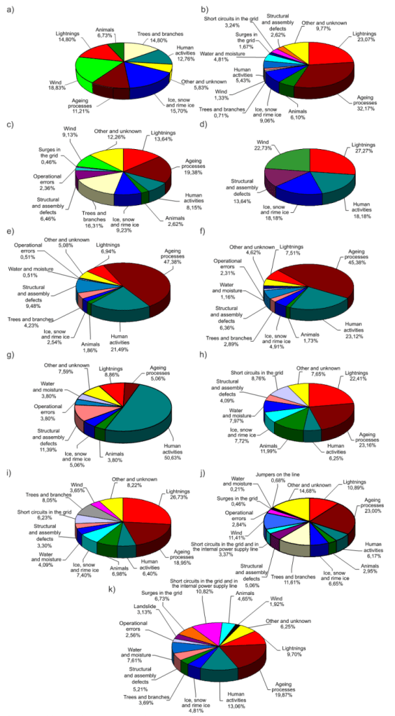 6. Since the number of failures caused by lightning is very high (14.8% for 110kV overhead lines, 23.07% for 110kV/MV substations, 13.64% and 27.27% for MV overhead lines with bare and insulated conductors, respectively, 22,41% and 26.73% for indoor and overhead MV/LV substations, respectively), it should be presumed that the lightning protection and surge protection systems in use are ineffective, which may be related to their improper implementation or operational errors.