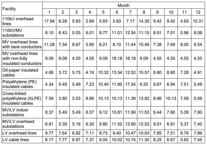Table 1. Frequency of damage to equipment and facilities operated in power distribution networks by month of the year [%]