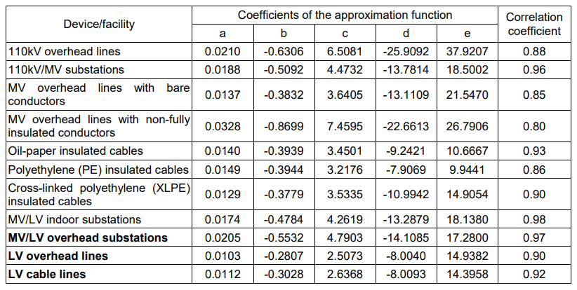 Table 2 shows the coefficients of the approximation functions of the seasonal variation of the frequency of failure of equipment and facilities operated in electric distribution networks. It also includes correlation coefficients of the determined functions against empirical data.