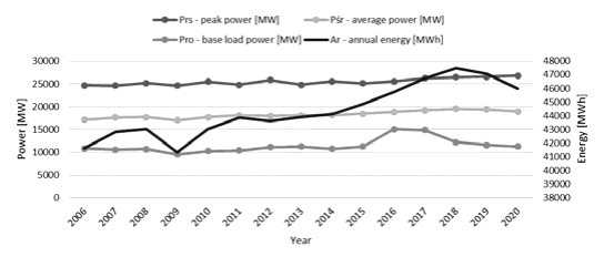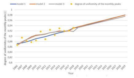 2. The general load trend of the power system remains unchanged, i. e. the load in winter is higher than in summer. However, the parameters determining the value and dynamics of these changes are currently completely different than they were for example 10 – 15 years ago. As the analyzes carried out show, there is a trend of load balancing in the power system load. The ratio of base load power to peak load power increases slowly but steadily. This trend was very well illustrated by the realized econometric models.
