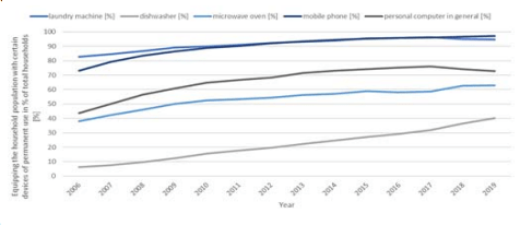 Table 2 and figure 6 show an increase in household equipment with some electrical appliances. Today almost every consumer owns a mobile phone and a washing machine. There has also been a significant increase in the number of households equipped with dishwashers (from a few percent in 2006 to almost 40 percent in 2018) microwave ovens and computers (from around 40 percent at the beginning of the observation period to over 60 percent in the last year of observation). The chart in Figure 7 also shows the growing consumerism of our society which is increasing the energy consumption of households. Undoubtedly automation has also entered our homes and increasingly technologically advanced equipment is helping us to fulfill our daily chores. At present there are no statistics concerning the equipment of the inhabitants with commonly used gadgets and equipment such as game consoles, tablets, smart watches, music players, electric toothbrushes, slicers, multifunctional food processors, electric induction hobs, air purifiers etc. which also contribute to the increase of energy consumption by the municipal customers.