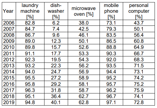 On the basis of extensive statistical surveys making a detailed analysis of the quantities affecting the value of the basic load degree mro. the following were adopted as explanatory variables for the model: X1 – equipment of households with washing machines [%], X2 – equipment of households with dishwashers [%], X3 – equipment of households with microwave ovens [%], X4 – equipment of households with mobile phones [%], X5 –equipment of households with personal computers [%].