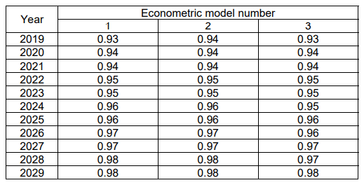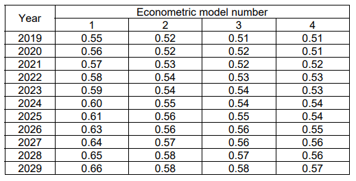 On the basis of the developed econometric models, a medium-term forecast of indicator mro for the years 2019- 2029 was made. Table 4 and Figure 8 present the forecast values. The forecasts were made on the assumption that the trend of all explanatory variables remains unchanged.