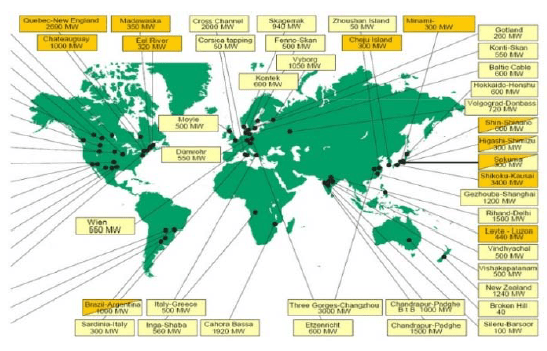 HVDC electrical power transport technology has been, for a long time, used in a limited manner for some important projects. The investments in these projects helped to experiment the new invented technologies and rise the met challenges. Nowadays, HVDC systems become so competitive that under certain conditions it overcomes the HVAC technology which permits an important deployment of HVDC systems. Figure 2 gives a graphical HVDC projects’ spread in different parts of the world.