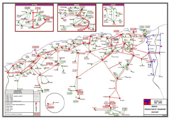 Figure 3 gives an overview of the topology of the electricity production stations and transmission lines of the Algerian network deployment. The production stations goes from 220KV (red circles) down to 60KV (green circles). The transportation lines use the same color codification (red for 220KV and green for 60KV) [7], [8].