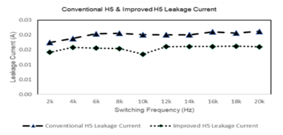 The relationship between leakage current and switching frequency of inverter topologies are presented in Fig. 7. and Fig. 8. The conventional H4 topology exhibits low current leakage at the beginning, with 59 mA at a 2 kHz switching frequency before increasing to 500 mA at 4 kHz. The current leakage of the conventional H4 topology then decreases at 4 kHz and 6 kHz before experiencing a sudden increase at 10 kHz, 12 kHz and 14 kHz, with a highest recorded value of 1097 mA. The current leakage then decreases again to 226 mA at 16 kHz before reaching its lowest recorded value of 43 mA at 18 kHz.
