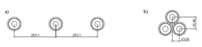 The short-circuit impedance is also dependent upon the formation of phase cables within the cable line. Simulations were carried out for both the flat and trefoil cable formations. The simulations used the same return conductor earth resistance (5 Ω) and transition resistance (5 Ω) as the previous simulations. For these simulations we only considered use of the CB system. Fig. 5 depicts the flat and trefoil cable formations.