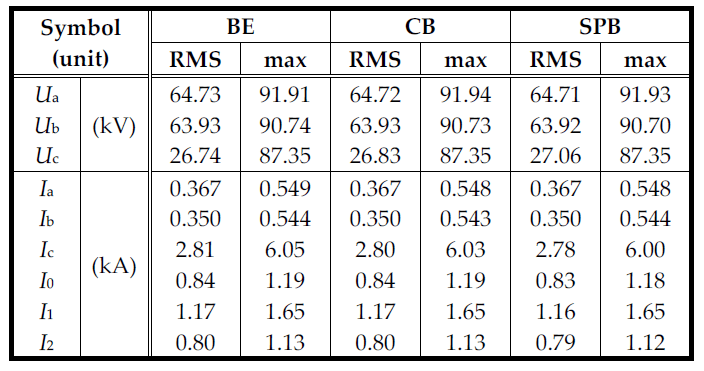 Table 1. RMS and maximum values of the phase voltages and currents, in addition to individual symmetrical current components for the BE, CB, and SPB systems.