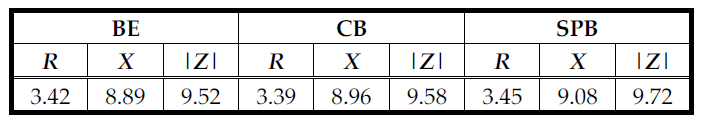 Table 2. Fault steady-state (final) values of resistance (Ω), reactance (Ω), and earth-fault impedance modulus (Ω) (phase L3), for the BE, CB, and SPB systems.