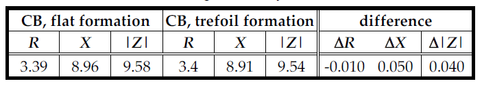 Table 3. Final values of resistance (Ω), reactance (Ω), and earth fault impedance modulus (Ω) (phase L3), for the flat and trefoil cable formations, when using the CB system.
