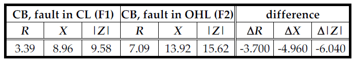 Each simulation ran for 0.25 s, using the CB system. Two different fault locations were considered, as shown in Fig 1. The fault at F1 was located within the cable line, and the fault at F2 was located within the overhead line. Table 5 summarizes the simulation results, showing RMS and maximum values of phase voltages and currents, in addition to individual symmetrical current components for each fault location. The parameters provided in Table 6 define the final locus of the phase-to-ground impedance phasor. The difference column shows the difference in parameter values between the two different faults.