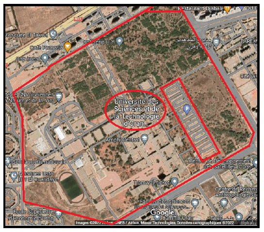 Oran, situated at 35.42° north and 0.38° west coordinates, lies on the southern coast of the Mediterranean basin and occupies a northwestern position within Algeria. In 1986, Oran launched the establishment of a university in Oran-East, subsequently recognized as the University of Sciences and Technology of Oran (USTO). (Figure 1)[16]. It is equipped with a large parking area, which holds great potential for the installation of photovoltaic panels (Figure 2).