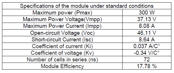 Table 2. Specifications of a photovoltaic module utilized